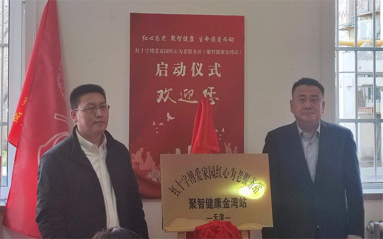 在与会嘉宾的见证下,天津市民政局养老服务处处长庞雨生与利发国际公益基金会秘书长叶军共同为红十字博爱家园红心为老服务站聚智健康金湾站揭牌。
